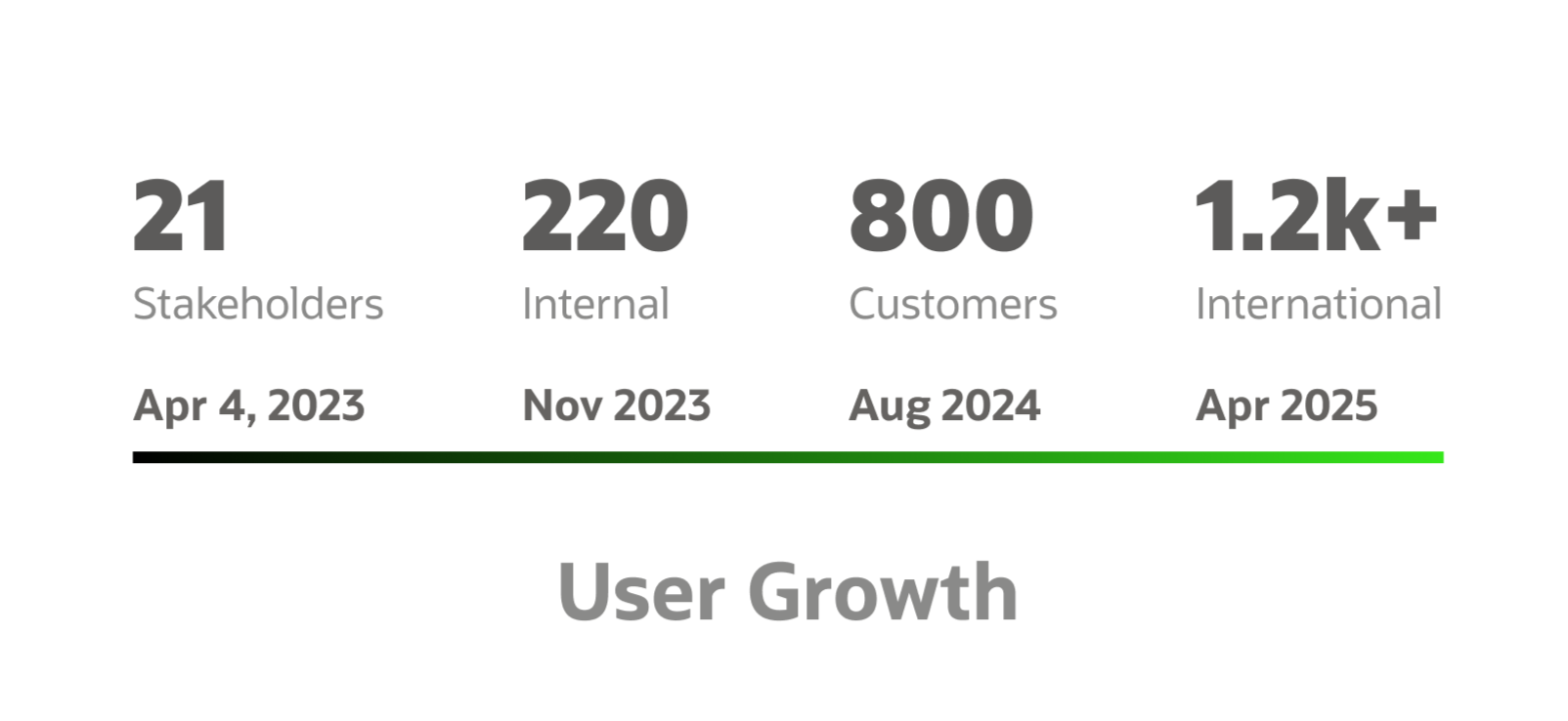 Timeline of user growth from 21 in April 2023 to more than 1,200 in April 2025