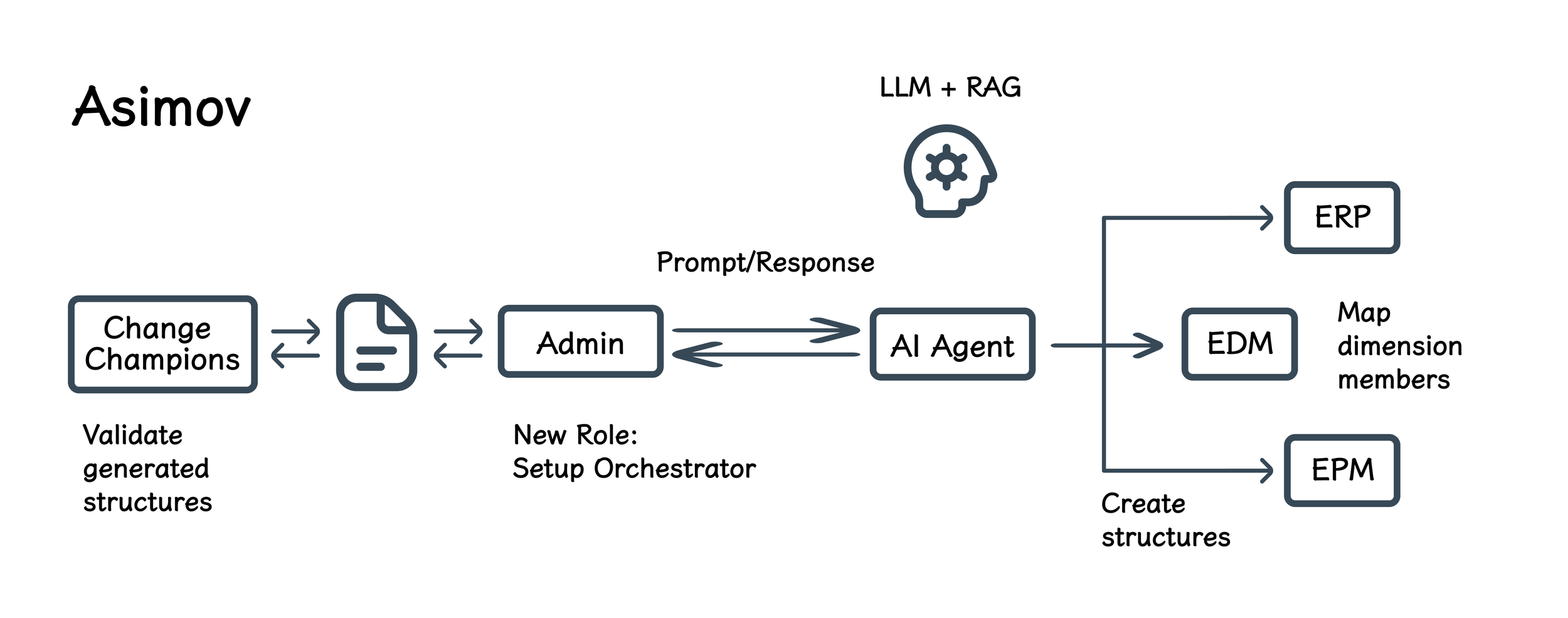 The product owner’s directive was bold: eliminate consultants from corporate finance app implementations and replace them with a natural language mechanism that could rapidly create enterprise structures and dimension members. But that wasn’t the only ambition. Asimov also had to hide the seams between ERP, EPM, and EDM so customers felt they were using a single product rather than three siloed applications. And finally, from the very first step, it needed to centralize key data such as dimensions, naming, and hierarchies, solving a problem that had plagued enterprises for decades.