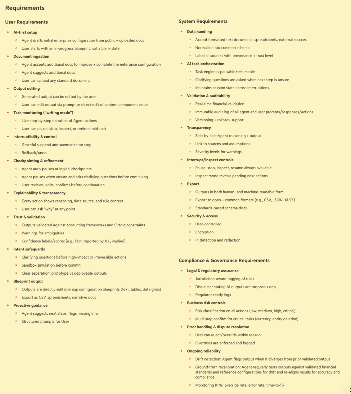These experiments directly addressed a growing obstacle: project managers and executives couldn’t pin down the nature, number, order, or content of documentation needed to produce a solid blueprint for ERP, EPM, and EDM configuration. Every week brought new uncertainty. I cut through the noise with real use-cases, showing exactly what each document could deliver and how generative AI, paired with the right UX patterns and governance, could accelerate foundation creation.
